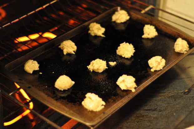 4. deje caer cucharadas de masa sobre una bandeja engrasada y hornee a 350 grados F durante 10-12 minutos o hasta que los bordes comiencen a brown.