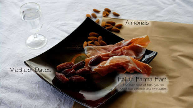 4. Envuelva la fecha rellenos de almendra con una media rebanada de jamón de Parma.