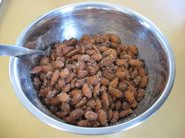 Difundir las almendras cubiertas uniformemente sobre la engrasada y agite suavemente la bandeja hacia adelante y hacia atrás un par de veces por lo que son en una sola capa. Puede que necesite utilizar dos sartenes si tus galletas no es lo suficientemente grande.