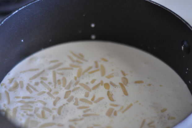 Comience a calentar la crema de leche y almendras en una cacerola pesada sobre medio. Justo antes de hervir, retirar del fuego y dejar para reposar durante 10 minutos.