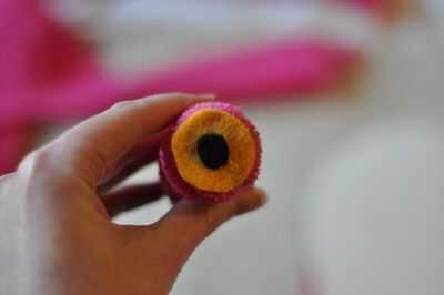 Corte el vellocino de oro para el mismo tamaño que la parte superior del cilindro y hacer círculos más pequeños para los alumnos. Cosas el interior con un poco de poliéster relleno para mantener su forma y pegar el fieltro con pegamento caliente.