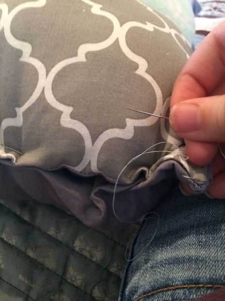 De este lado, girar lo que ha cosido adentro hacia fuera para revelar que tiene un lado más para coser. Coser esta parte con la forma de la almohada dentro de este es el último paso. Asegúrese de que la costura que está cosiendo se remete y se ve bien. Comenzar la línea de puntadas en la costura y hacer puntadas muy pequeñas. Esto se sujetan la almohada, pero tratar de hacer las puntadas tan pequeño como usted posiblemente puede todavía tener la puntada sujetan la almohada.