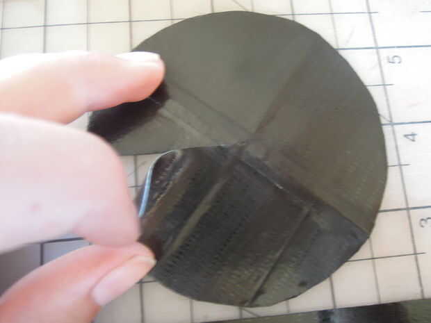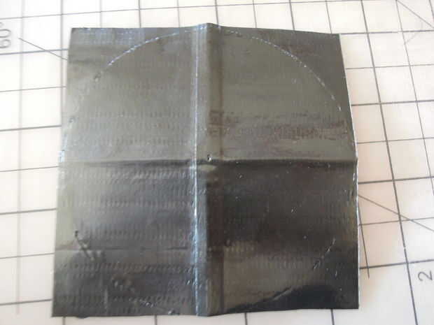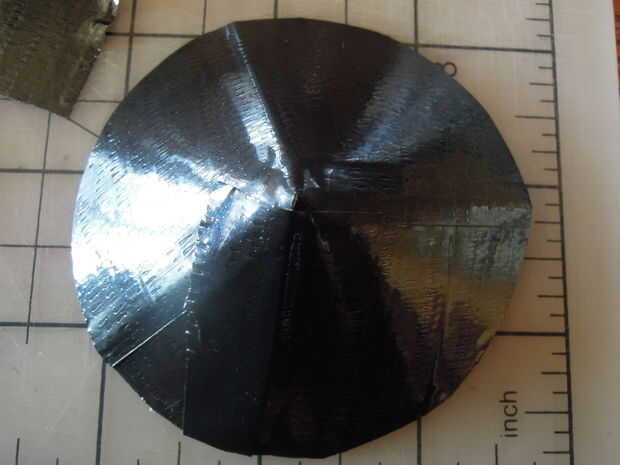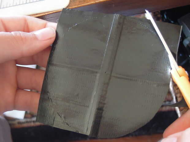 Ahora tendrá que hacer el cono que va en la parte superior del contenedor.  Hará que esta fuera de la hoja de la cinta de conducto.  Doblar la hoja por la mitad, desplegarlo, doblar en la mitad del camino y desplegarlo otra vez.  Ahora, coloque la punta de la aguja de la brújula de dibuja donde se encuentran los pliegues.  Dibujar un círculo que toque los bordes de la hoja de la cinta de conducto.  Cortar el círculo que sólo se ha acercado.  Corte a lo largo de la línea de doblez en el círculo hasta llegar al centro.  Luego cortar una tira de 1 3/4 pulgadas de largo.  Tire de un lado del corte sobre el otro hasta que el diámetro del círculo es de alrededor de 3 pulgadas.  Tomar 1 3/4 pulgada pieza y colóquela sobre la superposición corte.  Ahora tienes un cono!