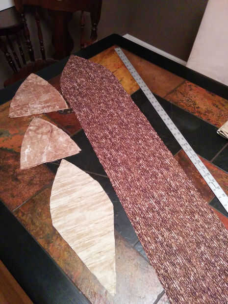 Primera parada era la tela. Yo sabía que quería 3 copias: una para el cuerpo principal, uno para el área exterior de la boca y para el interior boca y garganta. Quería que el cuerpo principal para dar la impresión de escalas gigantes y oscuros, boca interior a sentir como anillos de dientes de color más claros y la boca exterior algo que visualmente sería cerrar los otros dos. Después de 20 minutos de deambular alrededor de la tela tienda murmurando para mis adentros, terminé con una selección que estaba contento con. Tengo 2 yardas para el cuerpo principal y la mitad una yarda cada uno de los otros dos.