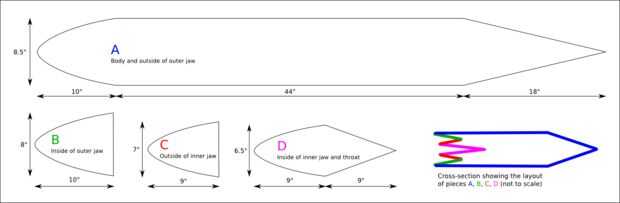 Al llegar a casa, medí algunas otras almohadas de cuerpo alrededor de la casa para la comparación. Decidí que quería un diámetro de cerca de 8 pulgadas y una longitud de como cerca de 2 yardas como podía conseguir. La forma general sería simple: un tubo largo, compuesto de 3 piezas. (Etiquetados "A" en el diagrama). Éstos tenían una mandíbula única "pétalo" en un extremo y un ahusamiento gradual en el otro extremo de la cola. Dentro de la mandíbula sección era un juego poco, B, en la tela exterior de la boca, levemente más pequeño para dar un arco cuando relleno. Dentro de este era la mandíbula de la boca interior, otra vez en dos partes C y D. La parte interna de la mandíbula interna, D, tenía una extensión para formar una garganta.