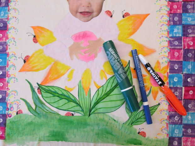 cuando las más grandes áreas de color se seca fui con marcadores de tela surtidos y finalmente un marcador de ropa muy fina, negro para realzar el detalle en mi almohada.