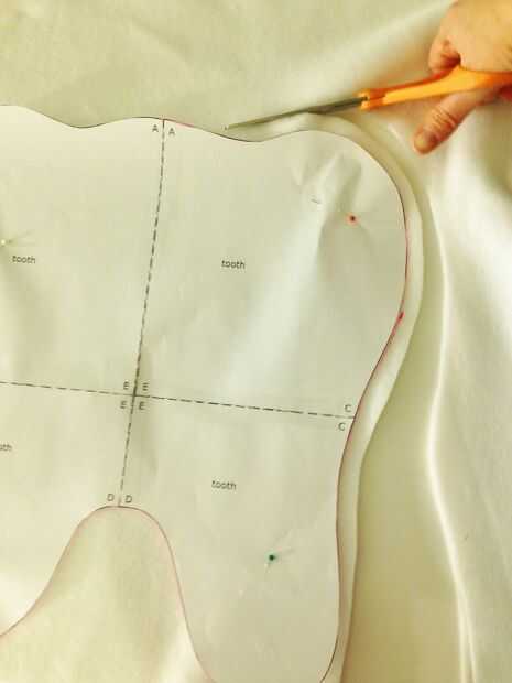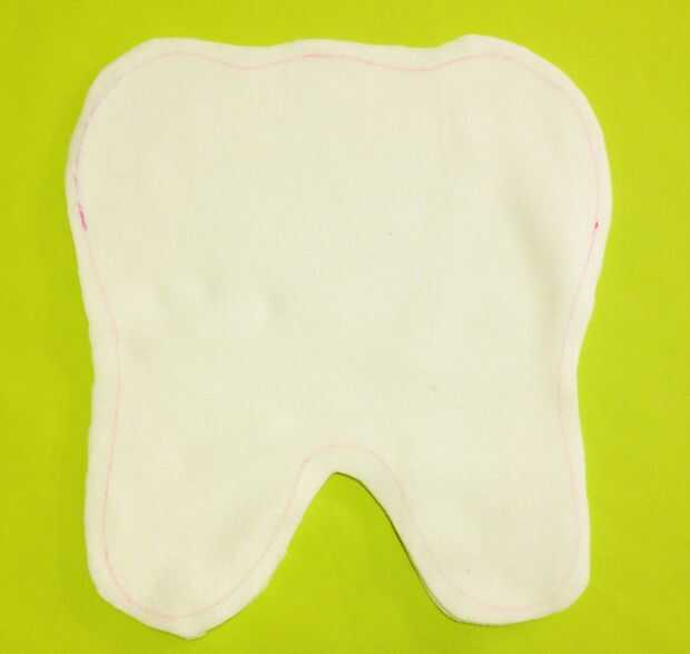Con un lápiz o pluma marca-b-gone, trace el patrón de dientes en tela polar blanco capas dobles y corte dejando una costura de 1/4". Observe que el patrón no incluye la costura. Asegúrese de rastro en el lado equivocado de la tela, una pluma de marca-b-gone se aconseja para tela blanca pluma marcas tienden a sangrar a través blanco. Marcas de Mark-b-gone pen pueden lavarse con agua.