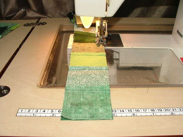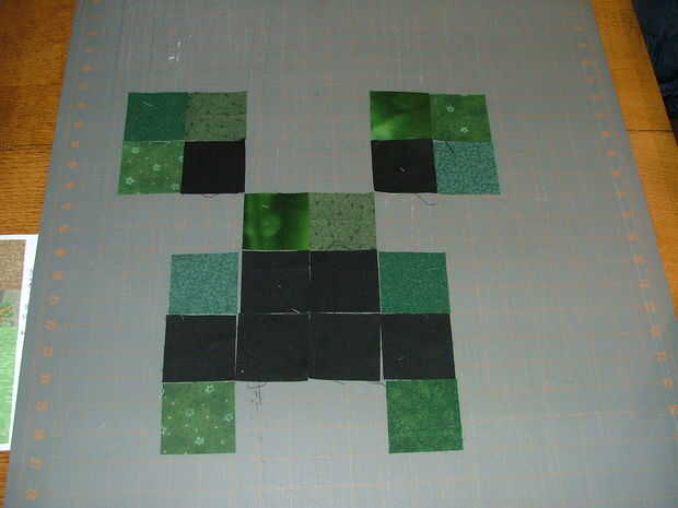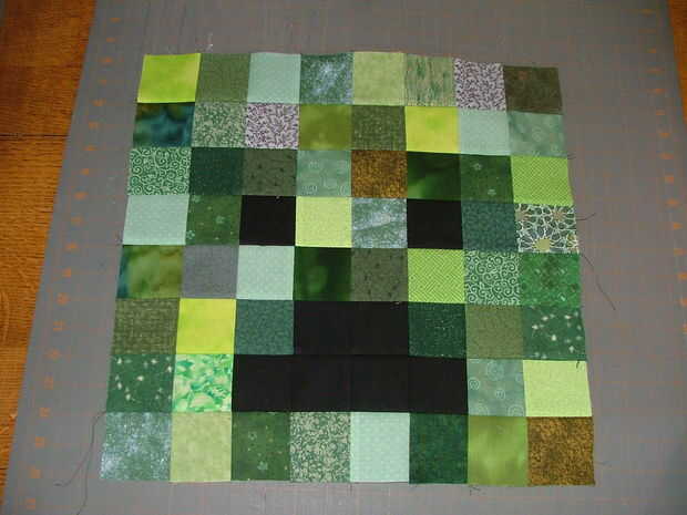 Coser los cuadrados en filas con una costura de 1/4" y presiona las costuras en cada fila en direcciones opuestas (por ejemplo, la fila 1 a la fila derecha, 2 a la izquierda, etc.). Coser las filas para hacer la cara de creeper que debe terminar en la Plaza de 16 1/2". Planchar todas las costuras largas con cuidado, asegurar que no terminen con la tela remete en el pliegue.