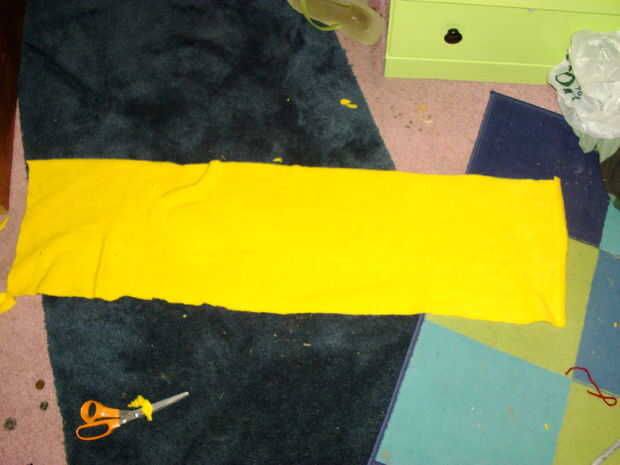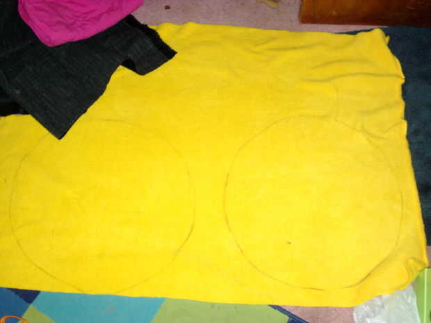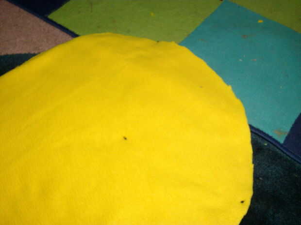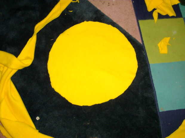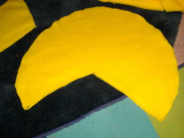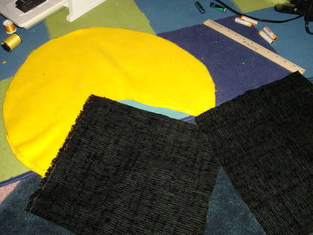 A continuación corte boca de Pacman fuera de los círculos. Estoy seguro de que sabrás lo que parece por lo que no explico dónde cortar y todo. Luego cortar dos piezas de nuevo material un pie de ancho que son un par de pulgadas más largos que la boca del Pacman. Si no desea que el interior de la boca para ser negro necesita su rectángulo amarillo para ser lo suficientemente largos para ir alrededor del círculo y de la boca. Entonces sólo coserlo alrededor de los bordes alrededor, sorta como en mi instructable para el fantasma de pacman.