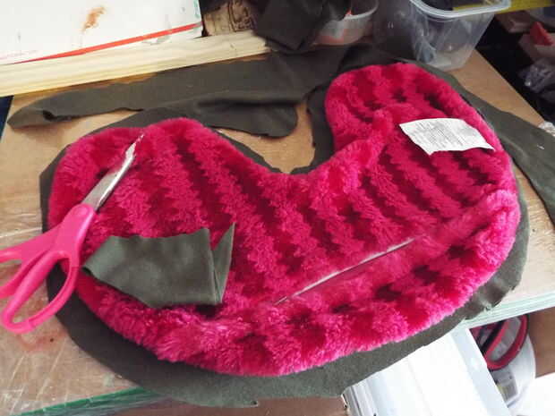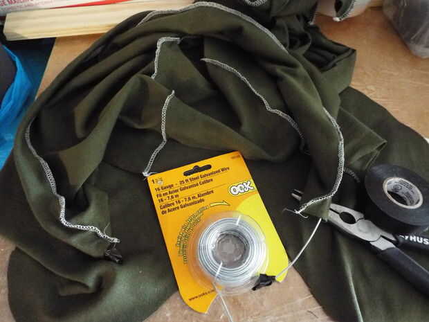 El alambre se encajona en un canal de tela en la campana. Cortar una longitud para caber y enrolle los extremos cortados. Puede que necesite doblar el extremo con la ayuda de un par de pinzas. Envuelva con cinta aislante para que no corte o pique. Prueba de ajuste. Retirar y dejar de lado hasta el final cuando se completa la costura.