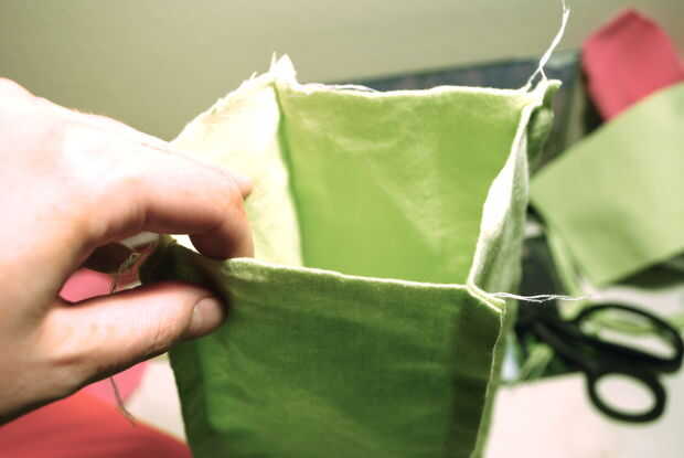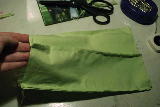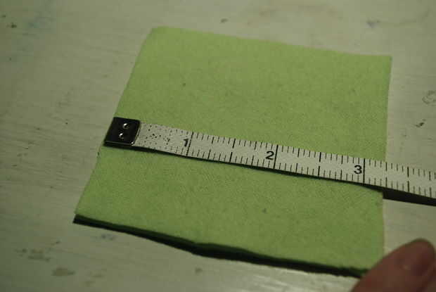 Cortar dos cuadrados de verdes luz que son 3 1/4" de ancho. Pin uno en el extremo del túnel cuadrado y coser todo el perímetro. Repita en el otro lado, dejando una abertura para rellenar. Llenar la almohada cuadrada pequeña con un montón de pelusa, coser el cierre y mueva el relleno por dentro hasta que se distribuya homogéneamente.