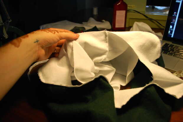Girar el tubo blanco que acaba de hacer derecho-lado-hacia fuera. Coloque dentro el gran sushi verde, dejando el reverso hacia fuera. Alinee el borde superior del tubo blanco con el borde del aro interior blanco (esperemos que la imagen ayuda a dar sentido a esa mezcolanza de instrucción). Alrededor del borde entero del perno y coser.