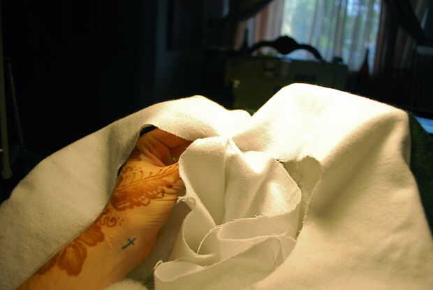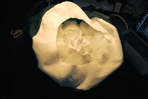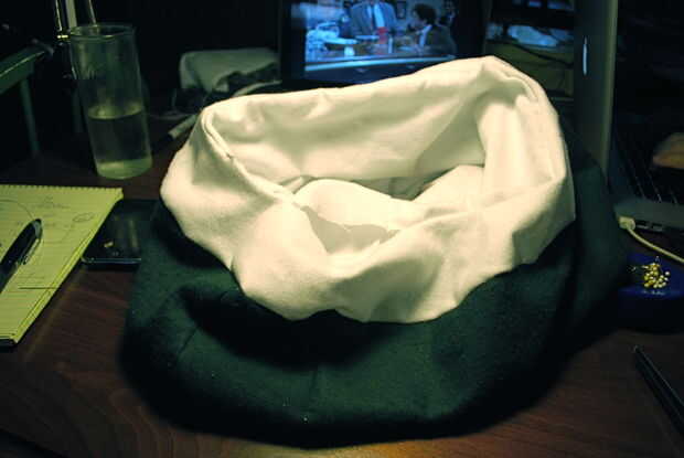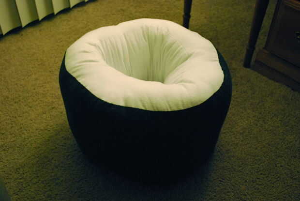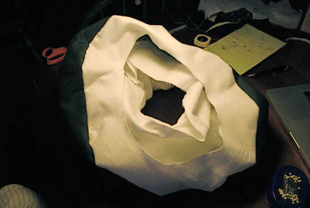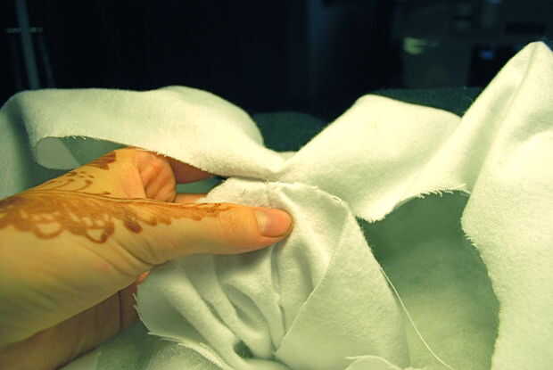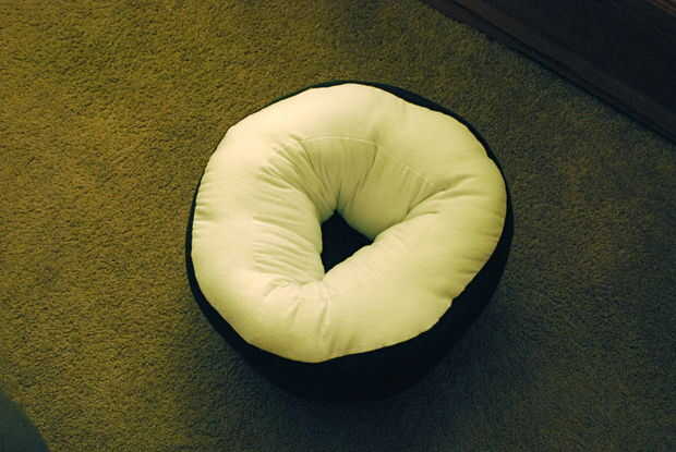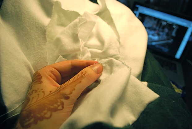 Mano non-dominate, juntos pellizque los lados derecha del tubo blanco y el borde interior del anillo blanco para que tu sujetador forma una costura en el interior de la almohada. Con una aguja e hilo, mano coser los bordes juntos desde el interior de la almohada.