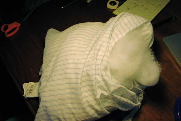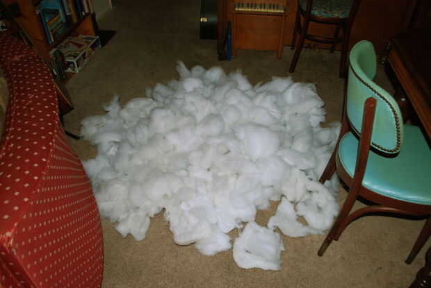 Corte todos los vasos relleno sacrificial que ha recogido y ripea todo el relleno hacia fuera. Usted necesitará mucho--esta almohada y su sushi interior pedacitos deben ser bastante rígido. Tome todo el relleno y hacer una gran pila, separándolas lleno bolas de relleno tanto como sea posible.