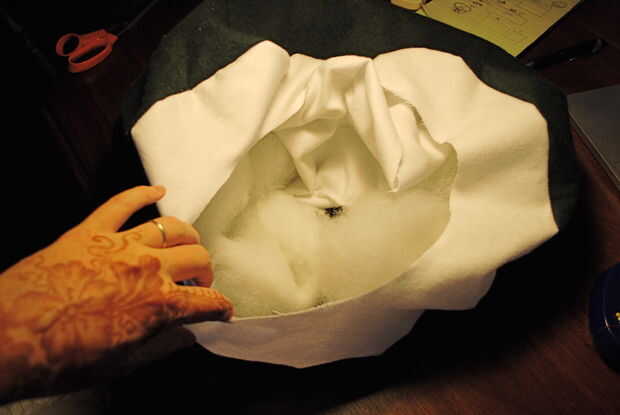 Seguir todo el camino alrededor del borde hasta que hay sólo unas pocas pulgadas izquierda para coser, ocultando la costura interior de la almohada. Llenar la almohada con relleno, embalaje hacia abajo a medida que avanza hasta que el sushi es muy rígido. Una vez que se rellena con pelusa, coser el cierre del orificio.
