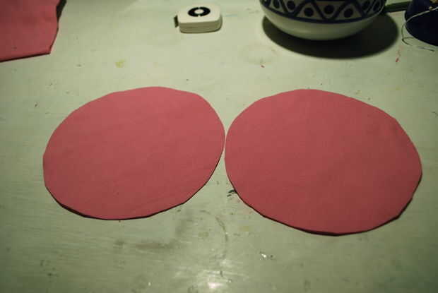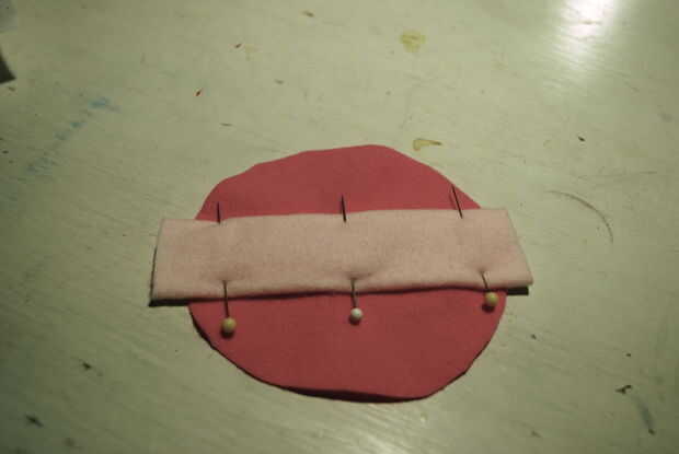 Teniendo todos los lados de derecha dentro del tubo, prender uno de los círculos rosa hasta el final del tubo, alineando los bordes como prender. Coser.