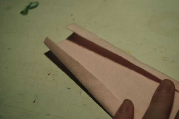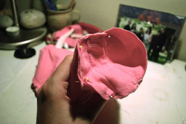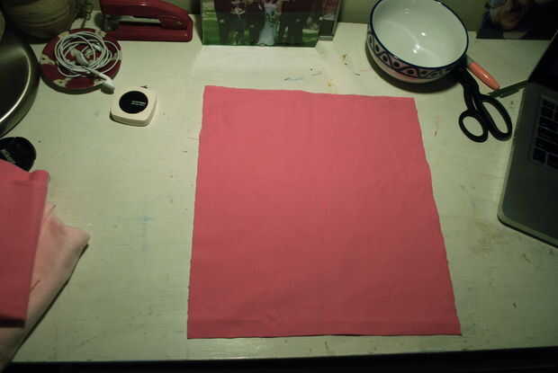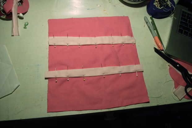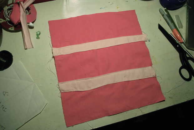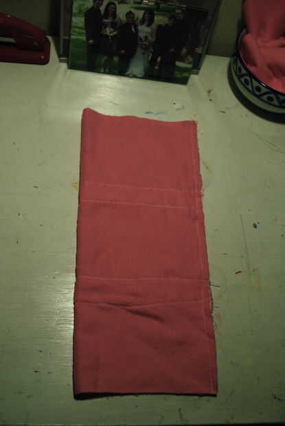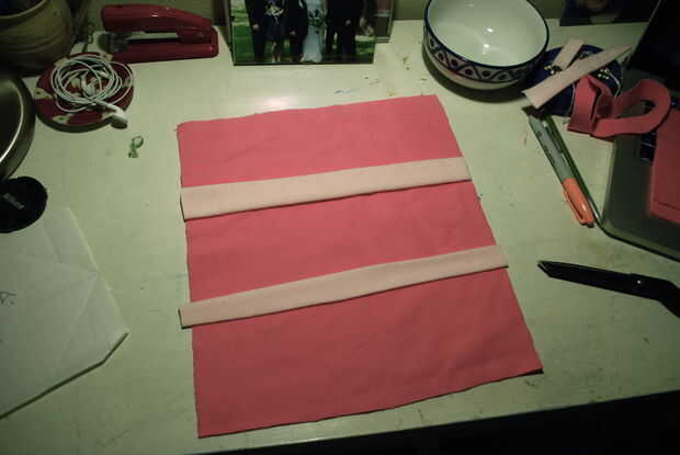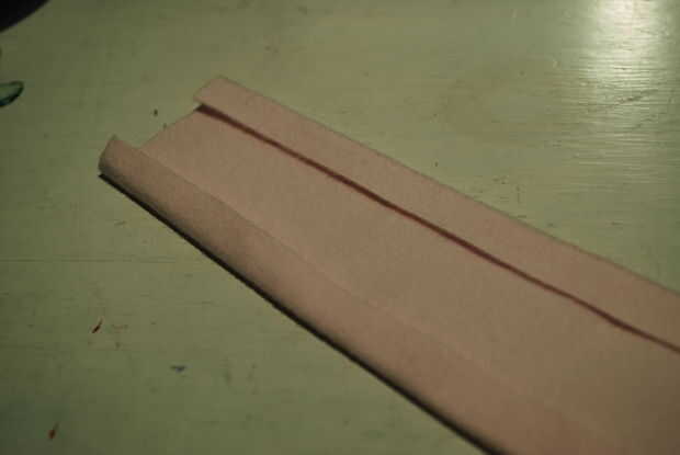 Doble el pedazo rectangular grande por la mitad con las bandas de color rosa ligeras en el interior para que se toquen los extremos de las bandas (debe alinear bien en la costura). PIN y coser en un tubo.