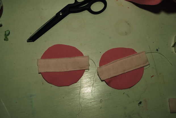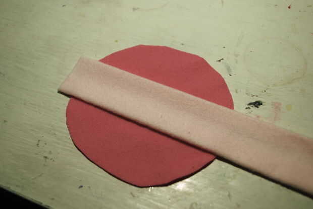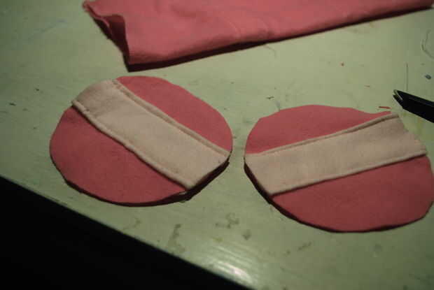 Cortar una tira larga de tela rosa luz 2" de ancho. Doble hacia abajo los bordes sobre 1/4 y plancha plana. Corte una sección de la franja para caber a través de cada círculo y dos tiras para ejecutar alrededor del tubo rosa y prender cada tira en lugar. Cosa en su lugar 1/8" del borde de la franja de color rosa clara. Después de coser, cortar las tiras de color rosa ligeras exceso de los círculos y tela de tubo.
