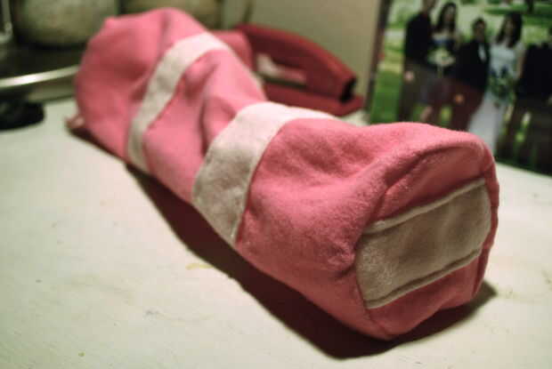 PIN del otro círculo rosa en el otro extremo del tubo y coser, dejando sobre una de 2" de apertura. Llene el tubo completo hasta que es muy rígido. Coser a mano la abertura y el relleno alrededor de dentro de la almohada de masaje para que se disperse uniformemente.