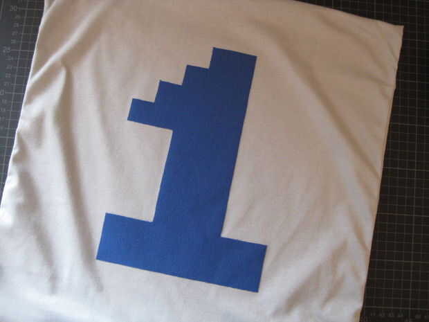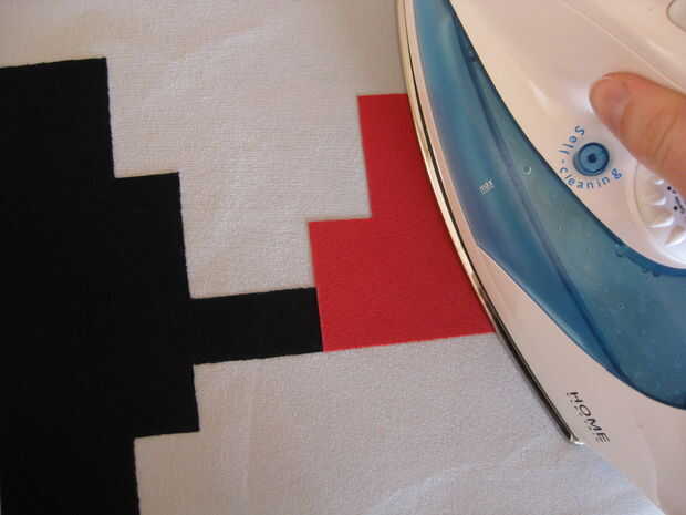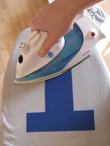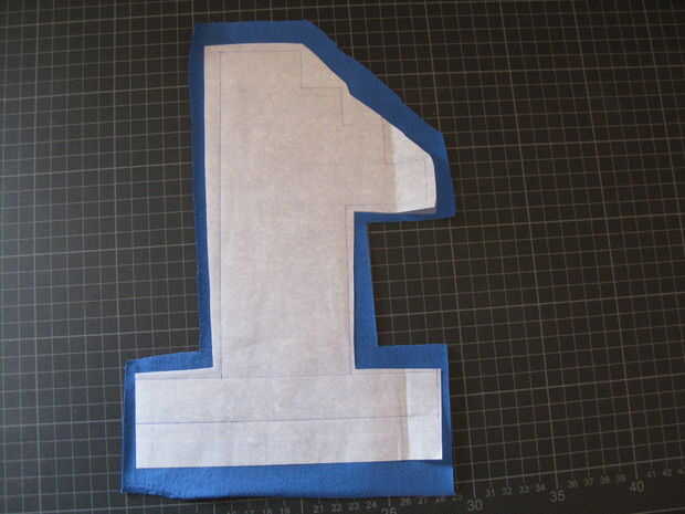 Ahora tendrás que eliminar al otro lado del papel de la web fusible, presione la plantilla sobre la tela y corte a lo largo de las líneas. Quitar el segundo lado de papel y presiónela sobre la tela gris claro. Si está satisfecho con la posición lo hierro en acuerdo con las instrucciones de su web fusible.