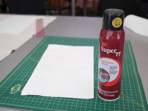 Ahora, aplique una capa uniforme de adhesivo spray Super 77 en la parte posterior de la plantilla de papel. Dejar secar durante un par de minutos y con cuidado Presione en el revestimiento de la plataforma precisamente donde quieres la imagen final que.