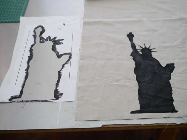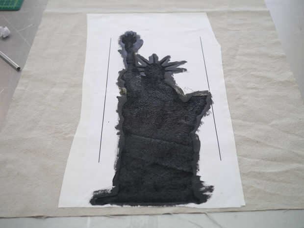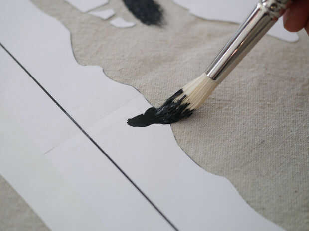 Con una capa de pintura en la lona puede despegarse la plantilla. Recomiendo esperando la pintura seca primero antes de retirar la plantilla que necesitará la pintura se seca para pasar al siguiente paso y sacarlo mientras que mojado puede provocar accidentes como la plantilla húmeda cae sobre la lona limpia, haciendo un lío.