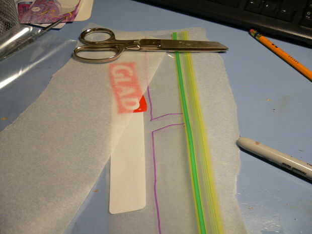 Paso 1: Marque una línea en la parte superior de la bolsa zip-lock, aproximadamente una pulgada debajo de la cerradura. En medio de la bolsa, poner dos líneas verticales de la parte superior de la bolsa a la línea que marcó. Debe ser aproximadamente 1/2 una pulgada de distancia y forman una caliente-botella de agua en forma de cuello.
