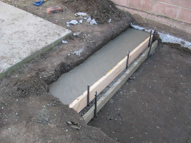 Vierta concreto con un par de barras integrados para agrega fuerza. La superficie superior sólo debe estar nivelada, no llana lisa. Tenga en cuenta que el tablero de 2 x 6 forma fue compensado de 2 x 4 para facilitar la primera extracción. Se ha posicionado a cuadrado (90°) con la pared de bloque existente en la parte trasera porque el RW lo seguirá y el RW define un lado de la almohadilla de la planta. Por otro lado, la forma de la huella de la roca de drenaje no es importante. La Junta de 2 x 4 se eliminarán durante el llenado de granito para evitar derrames en la roca de desagüe.