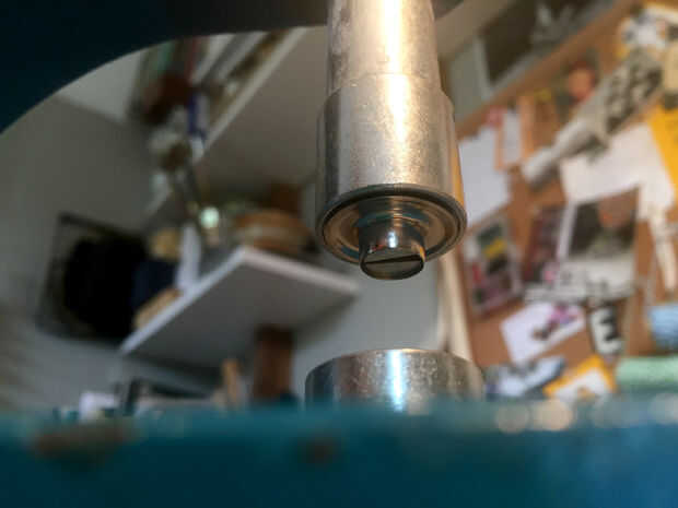 1. Coloque un fondo de ojal (el fino anillo) boca abajo en el dado de la parte inferior de la máquina.