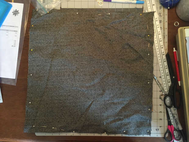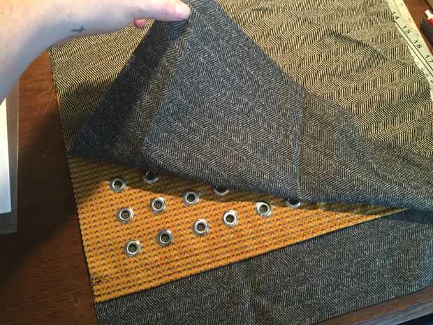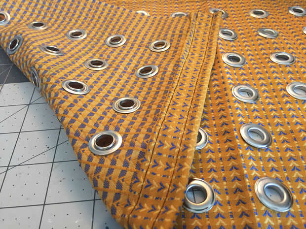 Coloque una de sus plazas de tela principal. En el centro de la Plaza, lugar de la raya grommety de gloria. Poner su otro cuadrado de tela principal en la parte superior, colocando su raya brillante de gloria en el medio. PIN todo y coser alrededor del borde, dejando una sección de cinco pulgadas en la parte inferior sin cosido. Cortar el las esquinas de la almohadilla, gire al revés, cosas y coser la parte inferior.