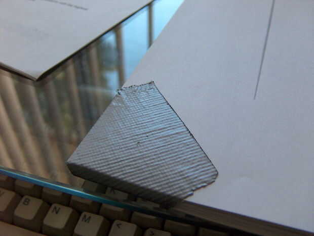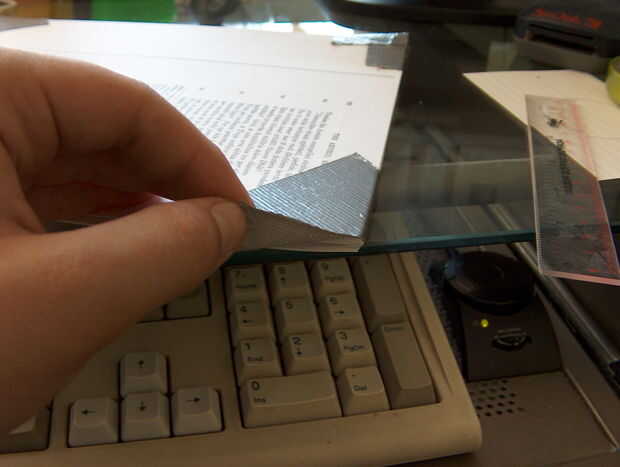 Empuje hacia abajo en una de las esquinas y linderos doblar la cinta sobre la esquina. Hay dos formas generales de lograr esto: utilizar dos tiras de cinta adhesiva perpendicularmente (más seguro) o diagonal (más rápido). Hice la parte superior izquierda e inferior derecha "con cinta de doble" y las restantes esquinas diagonalmente con cinta.