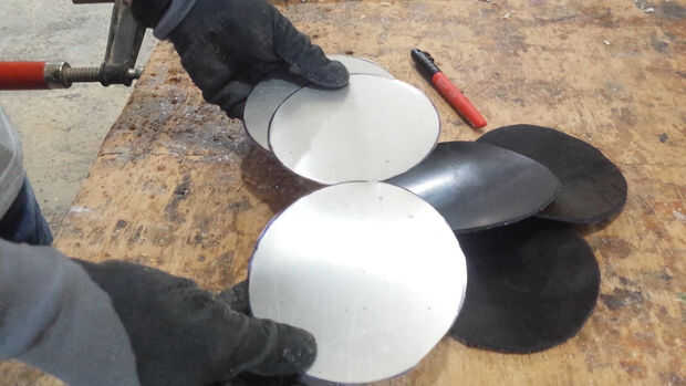 Con un esquileo del metal corte tres discos de metal de 12cm de su hoja de metal grueso de 1 mm y también tres discos de goma de 12 cm de tu hoja de caucho grueso de 3 mm