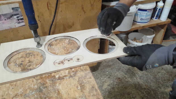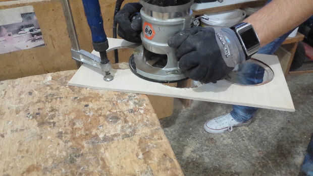 Usando un router y una broca de la barbilla, hicimos un rebajo profundo de 3 mm en cada uno de los orificios de la almohadilla. Los rebajos acomodarán las almohadillas de goma.