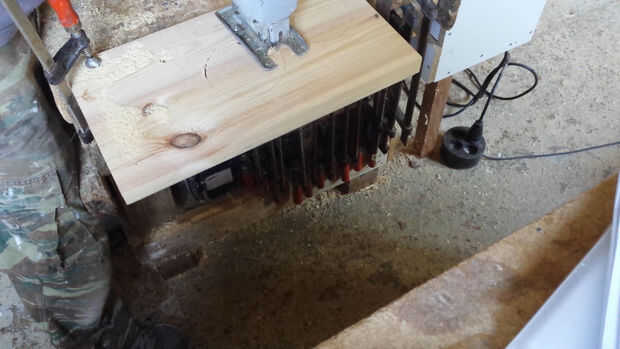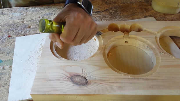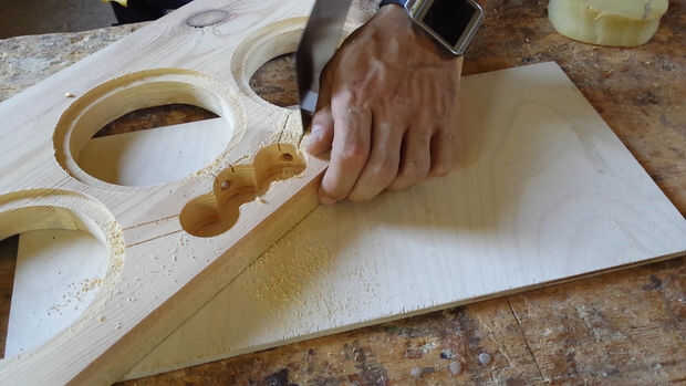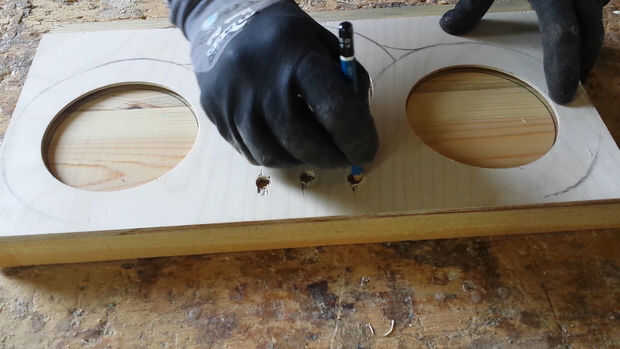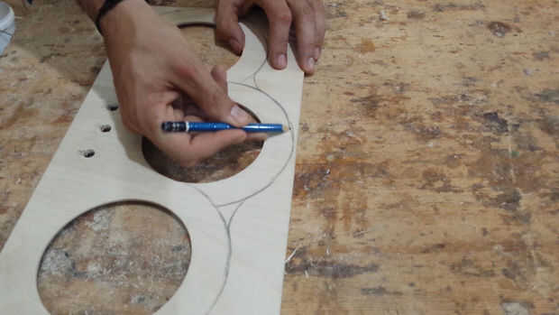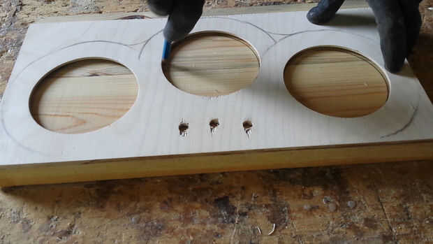 En este punto tenemos que hacer tres agujeros en la madera mediante una sierra de calar. Los agujeros deben estar alineados con los agujeros en la madera contrachapada.