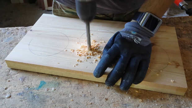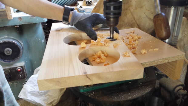 Ahora en el taladro, utilizando una pieza Forstner 25 mm tenemos que hacer tres agujeros para los enchufes y tres más de 2 mm rebajes profundos alrededor de los orificios de la almohadilla. Necesitamos esos rebajos sólo para asegurarse de que los discos del metal no toque a la madera y hacerla vibrar de activar las otras piezas.