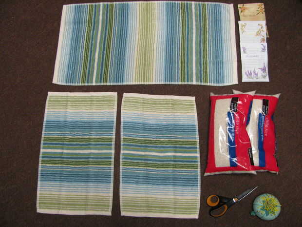 3 pedazos de lana o lo que sea acogedor tela quieres (no mida los... solo coloca los bolsos terminados en la parte superior del paño grueso y suave y cortar grandes suficiente para hacer un bolsillo y doblar el extremo abierto de cada almohada.)