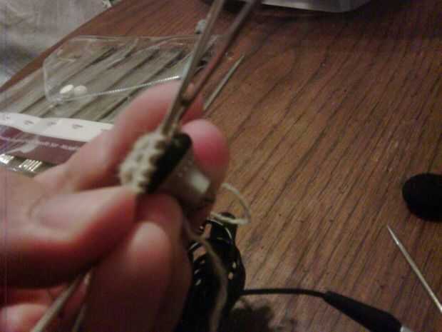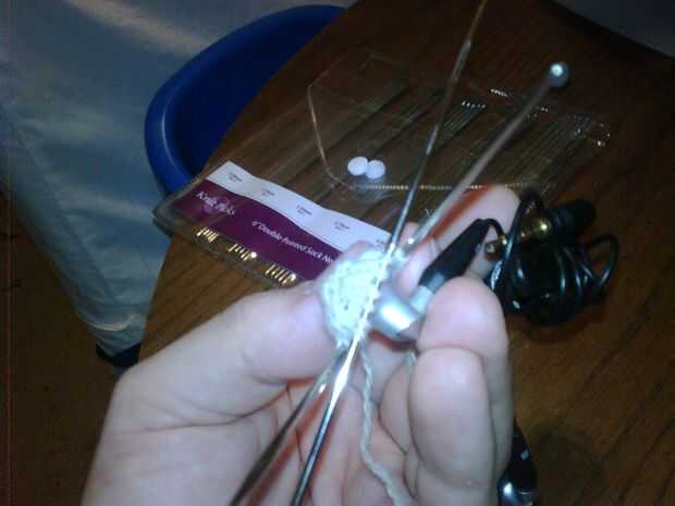 Después de unas cuantas rondas, voltea el trabajo y tire de la cola en el centro para apretar el nudo y unir todo. Un par más rondas de trabajo y de prueba para ajuste en su auricular. Cuando usted puede estirarla de manera que las tres agujas están en la parte posterior de la ' bud, que es el ajuste correcto. Para mí, llegué allí cuando hubo 18 puntadas en mis agujas, pero su kilometraje puede variar.