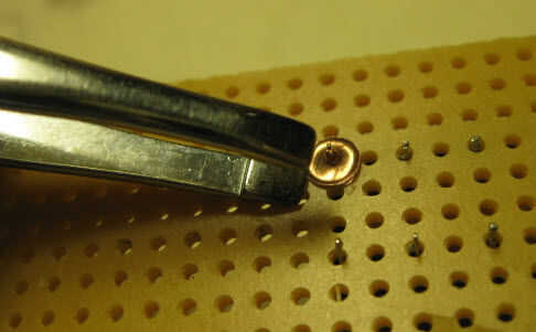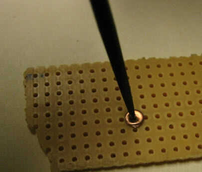 • Con la herramienta de asistencia de PCB con cuidado centro de la almohadilla sobre un agujero Perfboard y apuñalarlo.
