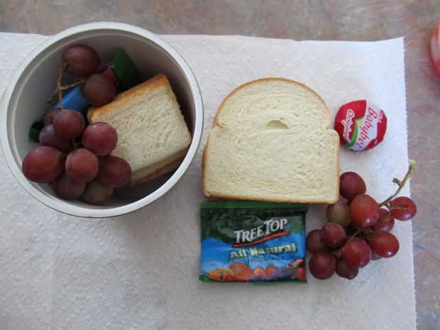* Hacer un picnic para el kiddos. Tenían mis cubos: 1 sandwich de PB & J, snacks de frutas, queso y algunas uvas. (Si quiere ser fiel a la película, usted querrá hacer un sándwich de jamón, pero acabo de hacer lo que tenia en mano). Paquete de la comida en la cubeta. Cortar el sándwich en cuartos y luego apilarlos. Esto permite más espacio para sus otras cosas. Coloque una servilleta doblada en la parte superior y cerrar bien.