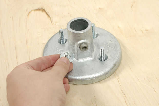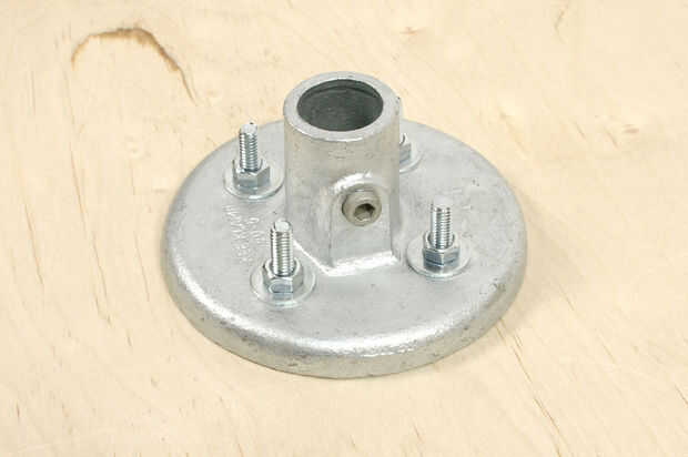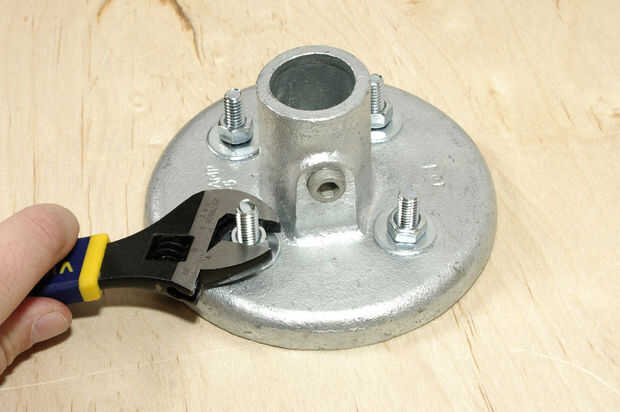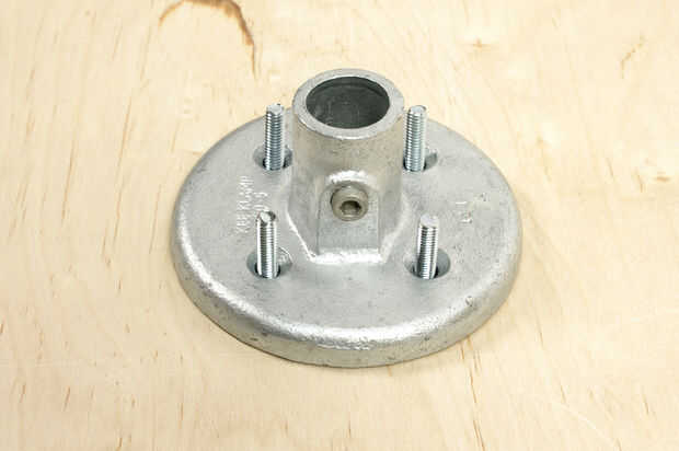 Nota: en la versión en la imagen, estoy utilizando una base de 5" Kee Klamp. Encontré el Kee Klamps no están diseñados para la rotación y el conjunto fue construido ligeramente descentrada. De esto dio la rueda un giro excéntrico. En última instancia terminó un montaje de aluminio de precisión de fresado. Sin embargo, si no tienes acceso a eso, la brida en la imagen inicial debe trabajar para usted.