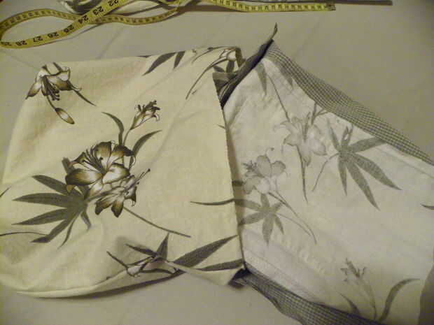 Colocar el forro dentro del bolso y del partido hasta las costuras laterales, doble hacia abajo 1" en el bolso y la guarnición. Perno en las costuras laterales solamente.