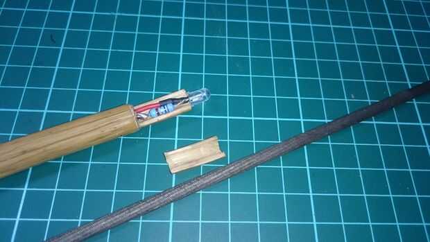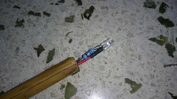 En la punta de la varilla de soldar el cable negro con el resistor y la resistencia de cátodo del emisor de IR LED (la pieza grande dentro). Luego suelde el cable rojo al ánodo del transmisor del IR LED (la pequeña pieza dentro). Poner un tubo del encogimiento del si es posible para evitar cortos. Debido a los gruesos cables usé, yo no podía empujar el LED. En cambio, me cortar otro trozo pequeño de bambú y había partido en dos en el diámetro. Luego presentar el interior para que la resistencia y los cables podrían caber dentro. Simplemente lo envolvió con cinta transparente.