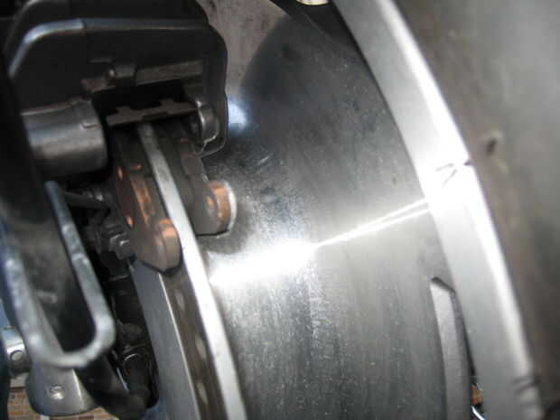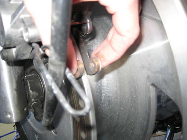 Cuando se saca el pasador de las pastillas son sólo conectado a la moto por fricción por lo que si bien puede caer su propia. Si se quedan en lugar de solo tire un poco en la parte inferior hasta que liberarse. Una vez que se libre usted debe comprobar para ver cómo desgastadas son y toma nota de cuántas millas llevó con ellos para futuras referencias.