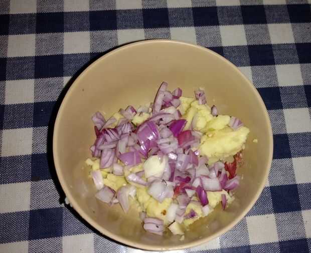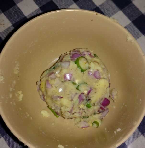 Una vez que las patatas son lo suficientemente frías como para manejar, pelar y triturarlos. Agregar chiles verdes, cilantro, comino, garam masala, polvo de mango y sal al puré de papas. Una vez bien mezclado, se mantenga a un lado para más tarde.