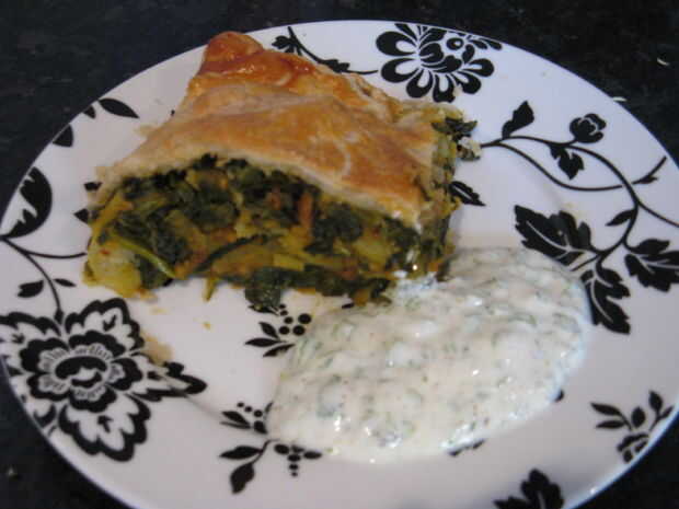 6. pincelar con huevo batido y cocer en el horno durante 25 minutos. Servir con una enfriamiento raita de pepino!