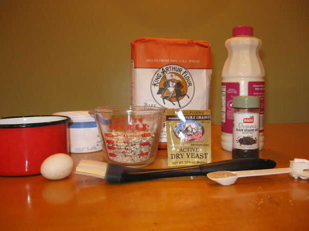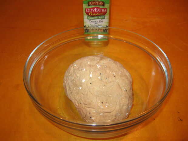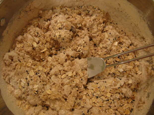 Calentar la leche justo antes el punto hirviendo, luego agregar la mantequilla, la sal y el resto de azúcar. Deje que se enfríe para calentar y luego añadir la mezcla de levadura. A continuación agregue la avena y la harina, revolviendo hasta que forme una bola. También en este pan he añadido aproximadamente una cucharadita de semillas de sésamo negro a la masa para la continuidad del exterior. No dude en ser creativo y probar variaciones. Volcar sobre una tabla enharinada y amasar durante unos 10 minutos. Forma una bola, coloque en un bowl aceitado, tapa y dejar leudar una hora hasta que se duplica en tamaño.