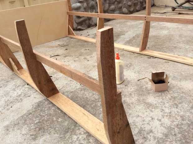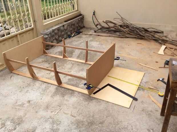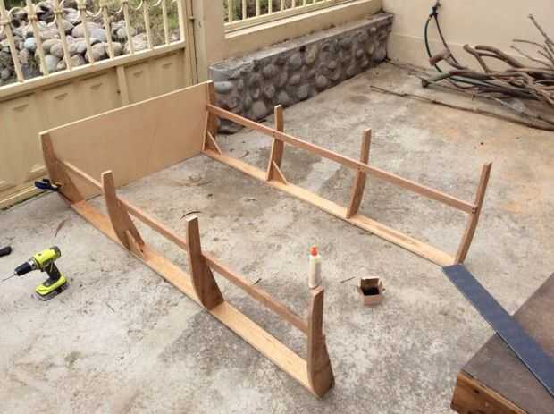 Luego dibujé el patrón en algunas capas de 1/2 pulgada tenía (cuna) y calculado el ancho del cama/del barco basado en el ancho del colchón. Temporalmente atornillado a la parte trasera para sujetar los lados hacia arriba (Foto 3). Uno para el frente de la corte también, pero basado en los montantes en la parte delantera.