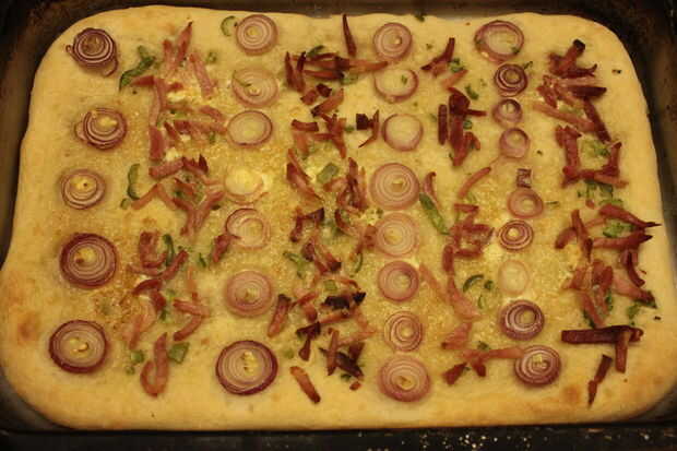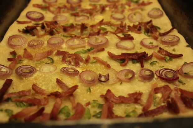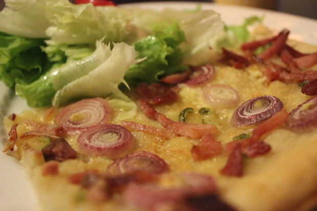 Alsacia es quizá mejor conocido por sus vinos blancos crujientes, hermosa arquitectura, anidantes cigüeñas y quiche pero también tiene un montón de deliciosas recetas conocidas menor, incluyendo esta delgada corteza, pizza quick BAKE (hornear). Flammkuchen/Flammekueche/Tarte flambée como su nombre indica es realmente flash al horno en la parte inferior del horno de pan es y era un pedazo de masa que se utiliza para probar la temperatura del horno antes de hornearla. Fue también una gran manera de panadero mismo provisto de un sabroso aperitivo!