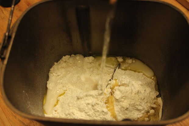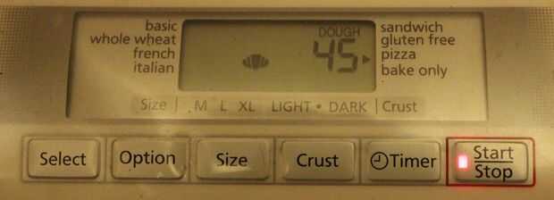 La máquina de pan está establecida en la receta de pizza, todo esto hace es mezclar la masa y deja el resto con una pequeña cantidad de la prueba de calor. El programa total tarda 45 minutos. Si haces esto a mano, sólo mezclar bien los ingredientes, amasar y poner a un lado durante unos 20 minutos descansar.