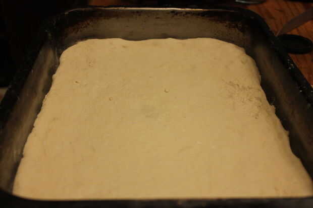 Coloque la masa en la lata enmantequillada. Luego cubrir con un paño y dejarlo probar durante unos minutos en la parte superior de un estante encima de la cocina de madera. Esto le permite relajarse y hacer un encendedor de base.